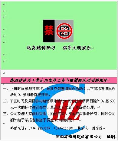 为了引导员工文明娱乐,远离赌博陋习,公司于2011年4月起正式推行禁赌令,并特制了禁赌卡分发给每一个本部员工,此举赢得了大家的认同,有效的遏制了赌博现象,提高企业员工的工作效率。